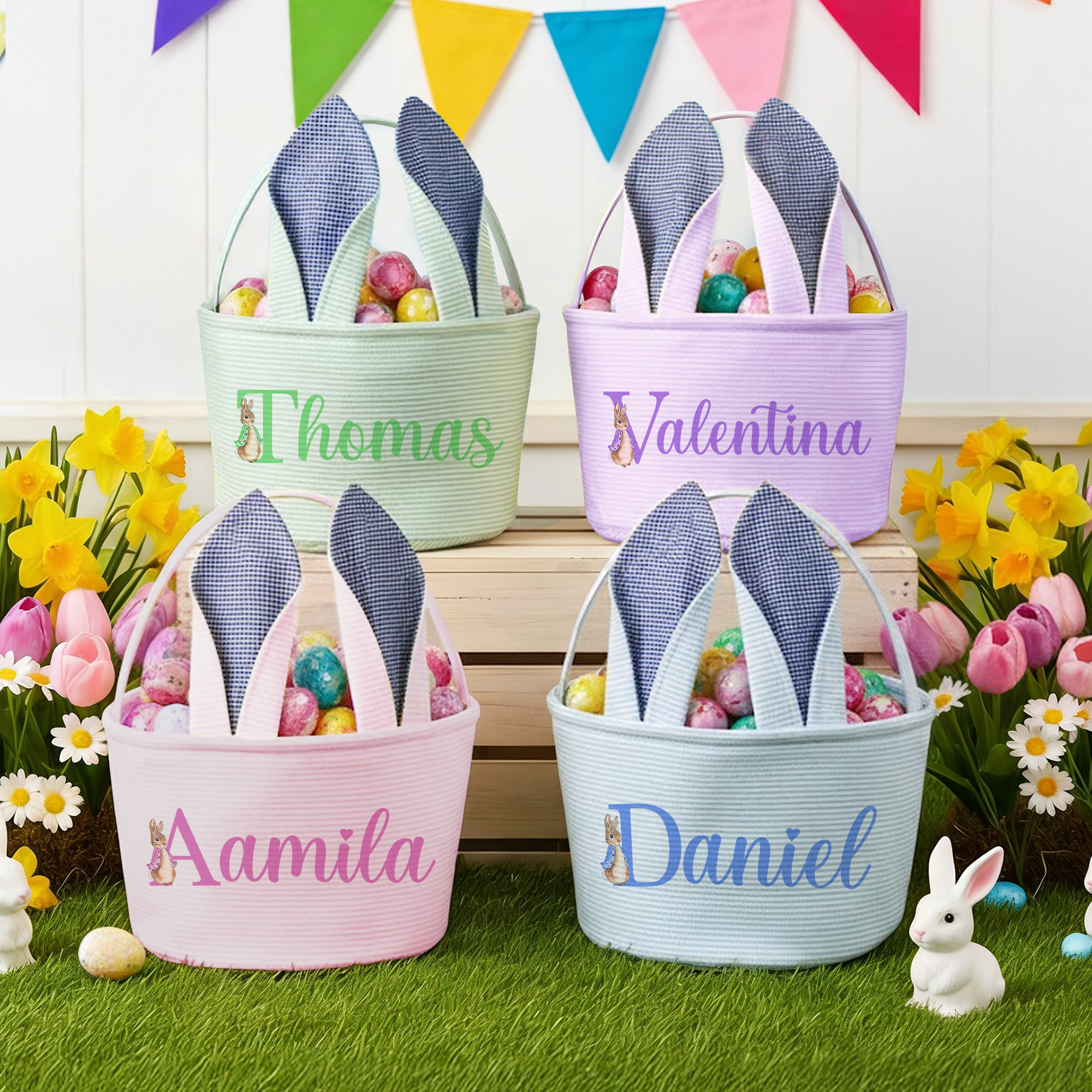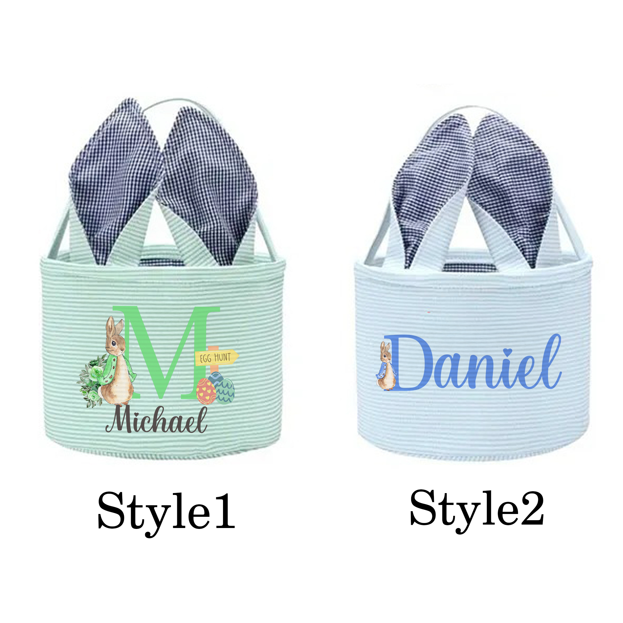 Style Custom Name Peter Rabbit Alphabet Easter Basket with Bunny Ears